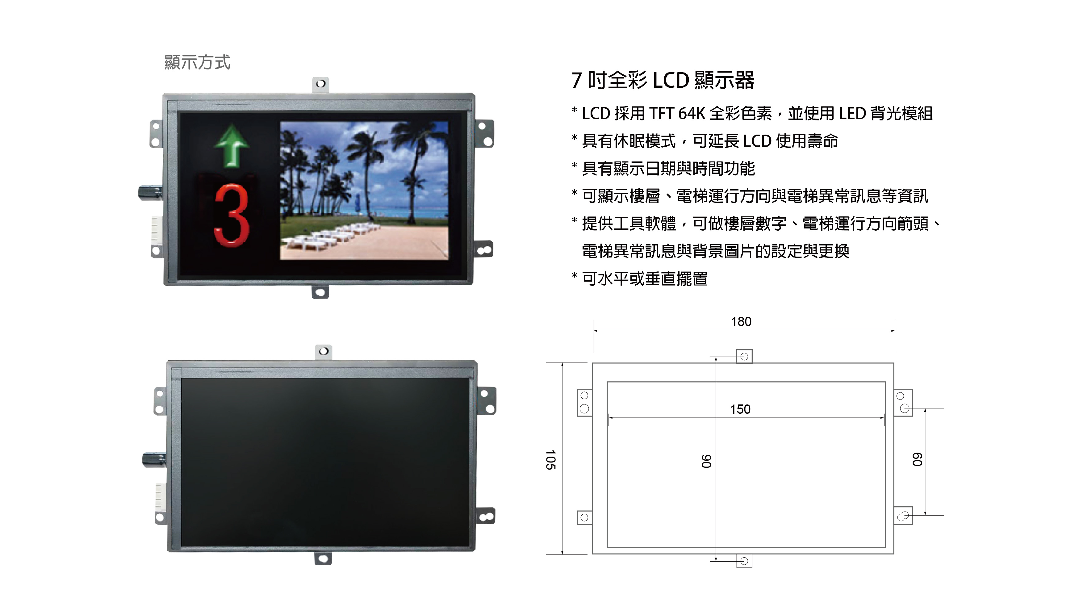 * 可顯示樓層、電梯運行方向與電梯異常訊息等資訊