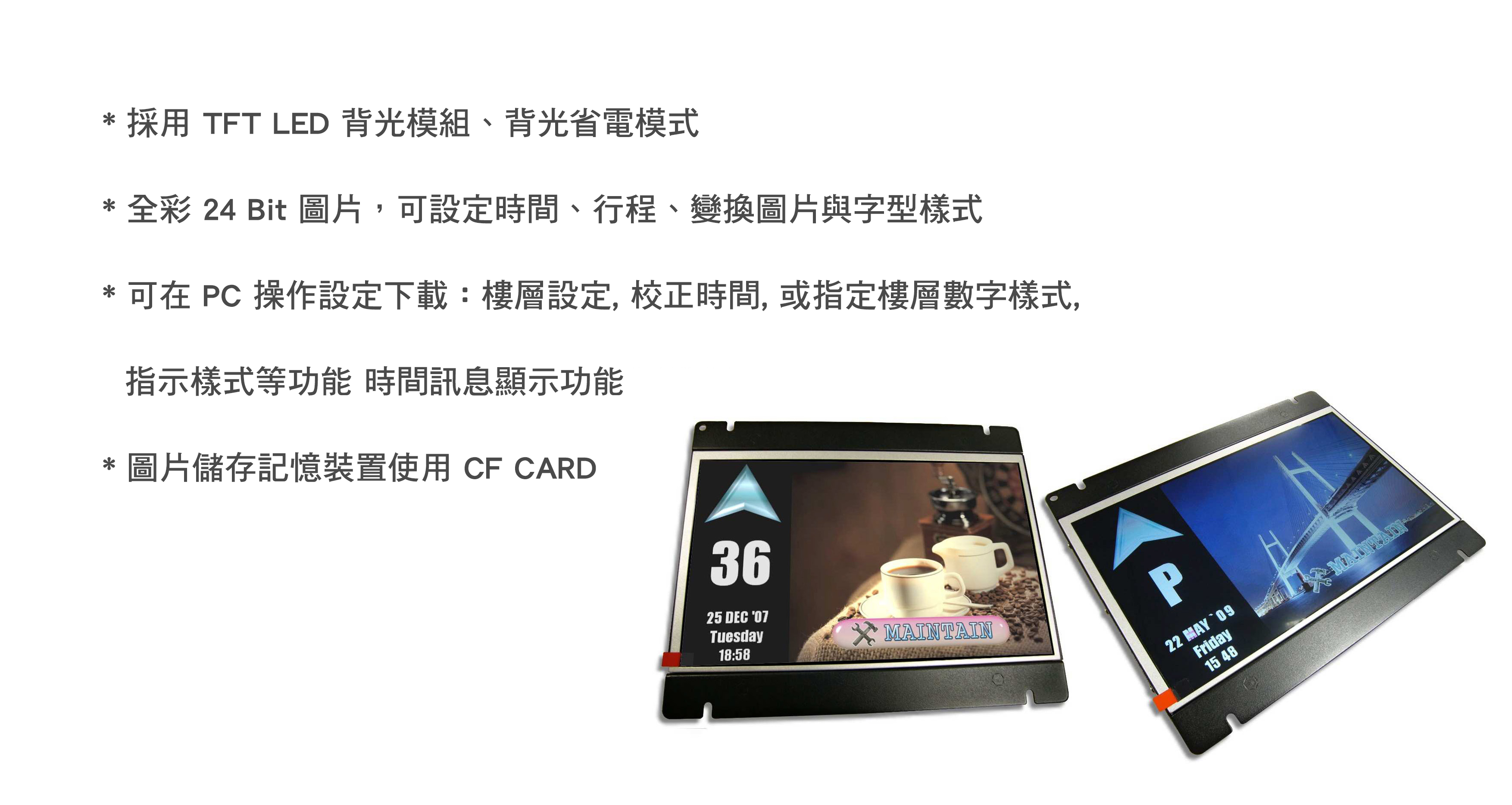 * 可在 PC 操作設定下載:樓層設定, 校正時間, 或指定樓層數字樣式, 指示樣式等功能