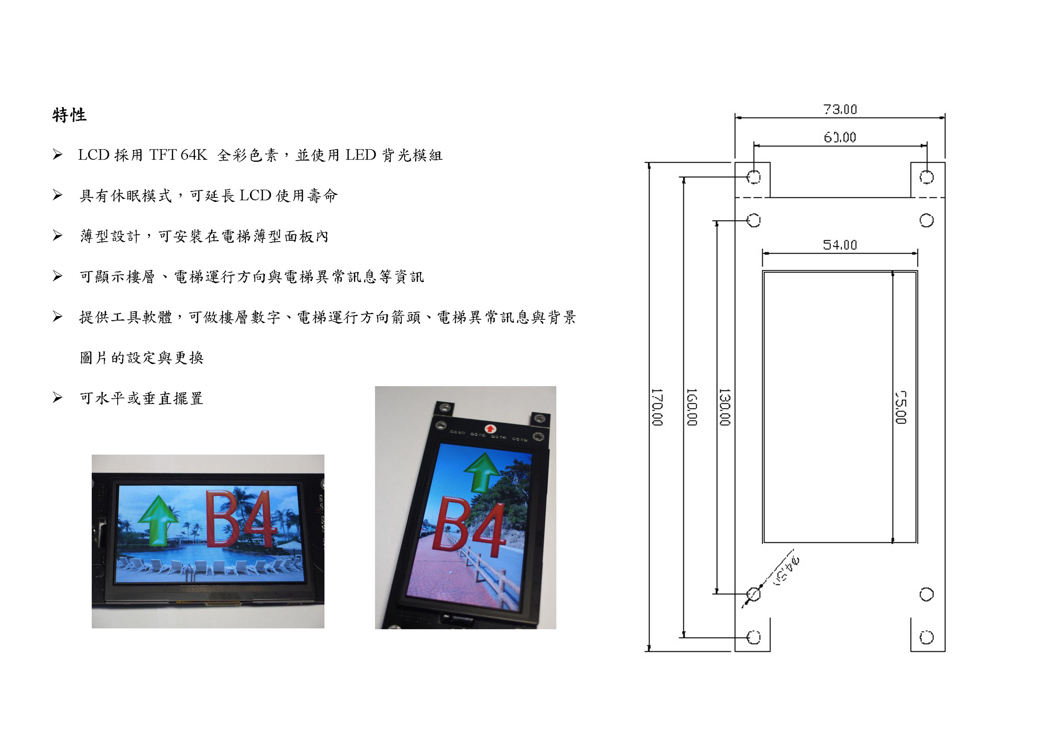 * 可顯示樓層、電梯運行方向與電梯異常訊息等資訊