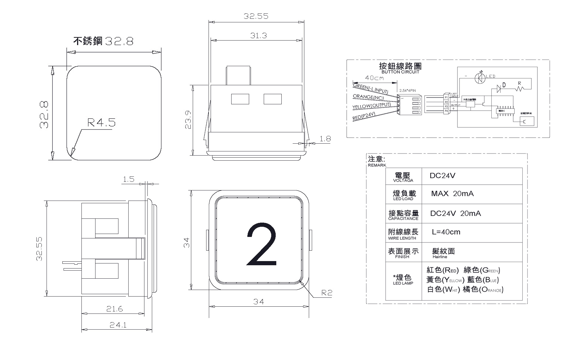 方形按鈕,表面髮紋不鏽鋼